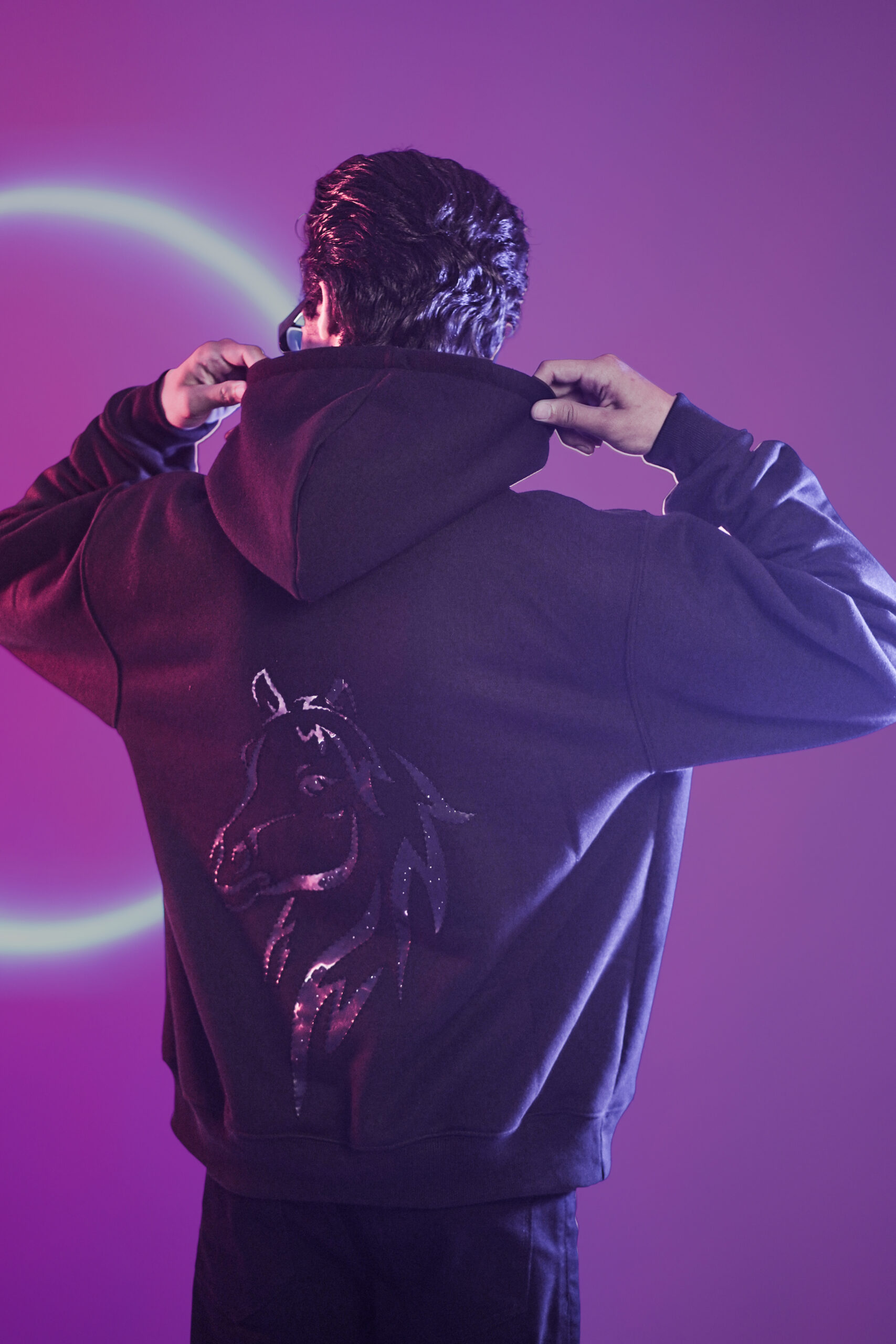 Our baggy-style hoodie is more than just streetwear—it’s a statement. Made from 100% cotton, it combines comfort with cosmic vibes through its Horse-Nebula inspired design. The running stitches on the back artwork add texture and uniqueness, making this hoodie a must-have for urban explorers and style icons.